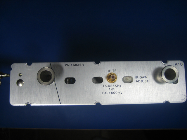 The second mixer module shown here has this nice test connector that couples to some of the 15.625 kHz second IF signal. You can then simply borrow the existing cable that sends the 10 MHz ref signal to the back panel and plug it in here. A very easy way to get the IF signal out of the chassis.